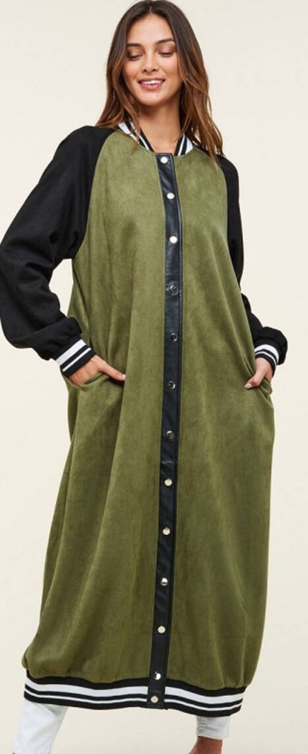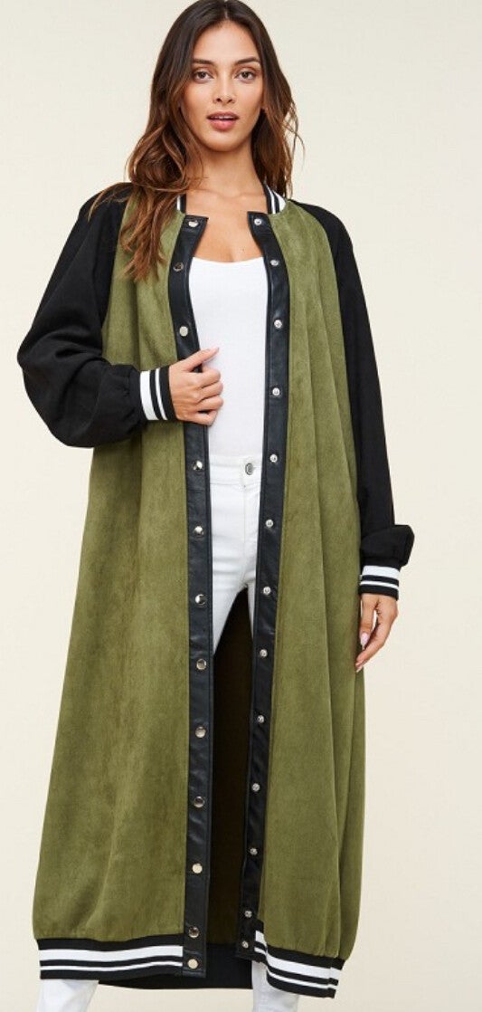 Introducing the Maxi Faux Suede Jacket in Green/Olive, a statement outerwear piece that effortlessly combines style, comfort, and sophistication. This jacket offers a unique color-blocked design, featuring snap buttons and a button-down front for a versatile and chic look.